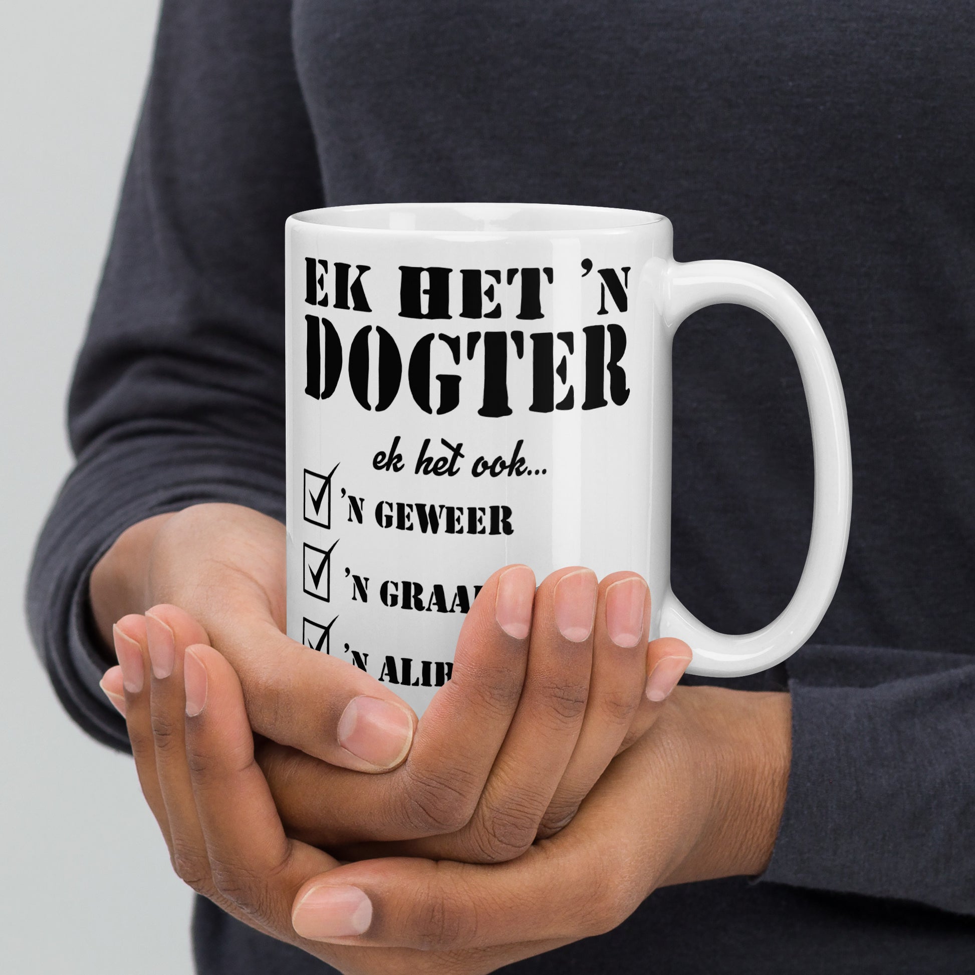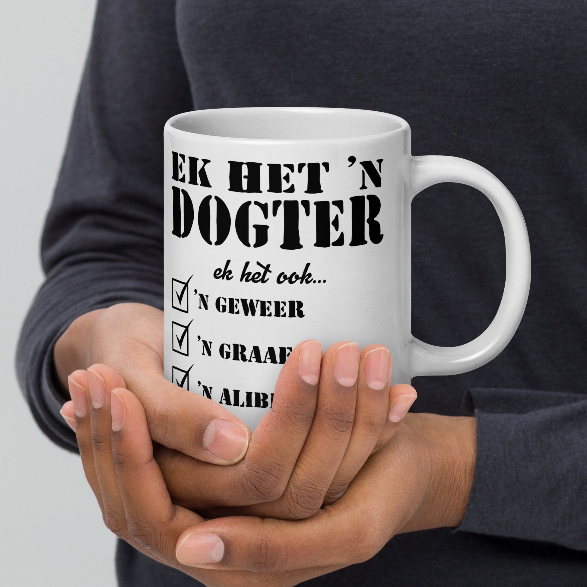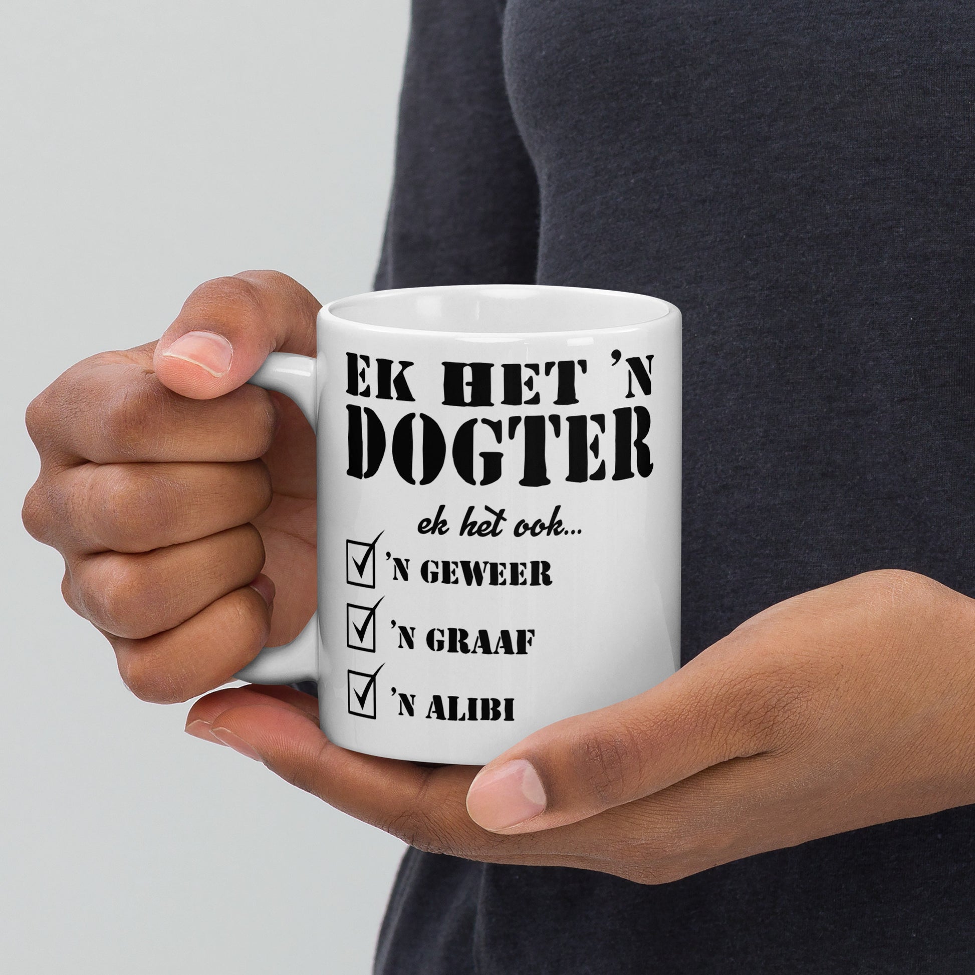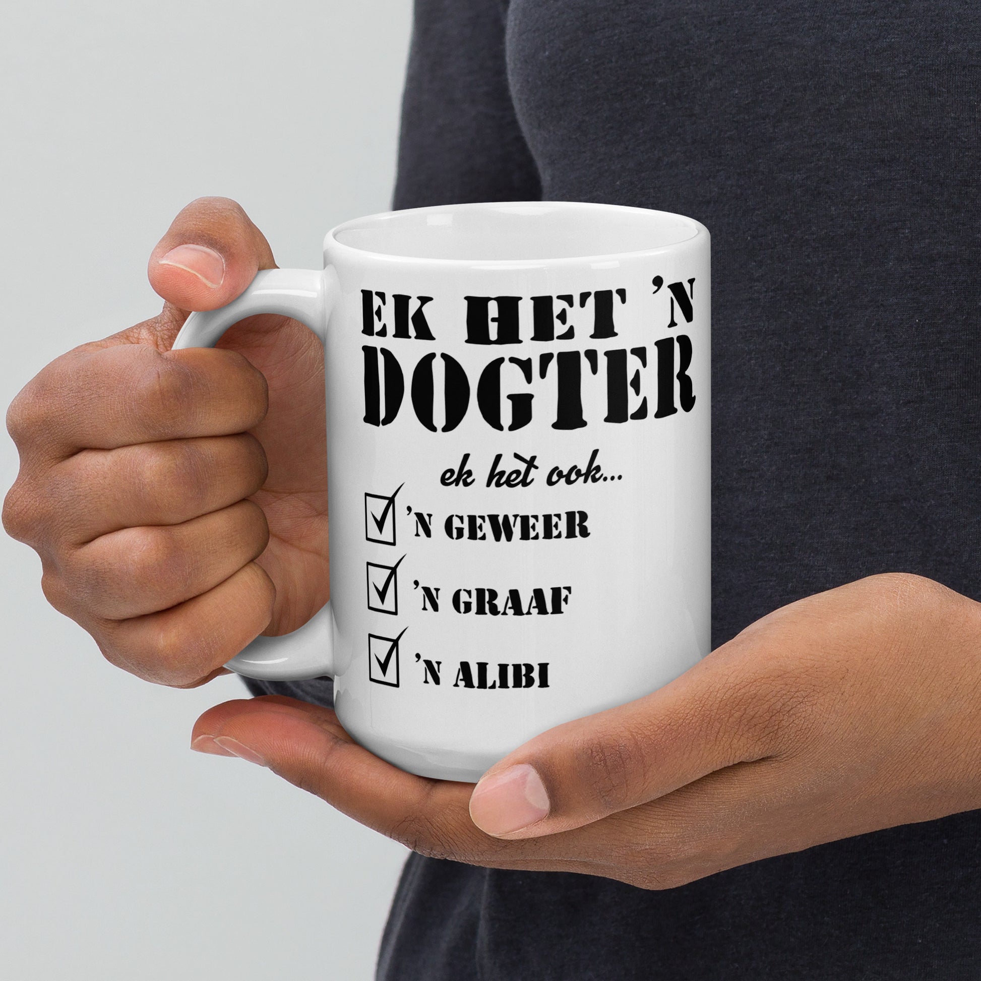 Die Pa-Alibi Beker sê dit soos dit is: “Ek het ’n dogter. Ek het ook ’n geweer, ’n graaf en ’n alibi.” Hierdie beker is gemaak vir die oorbeskermende pa met ’n sin vir humor… en dalk ’n “vriendelike waarskuwing”.